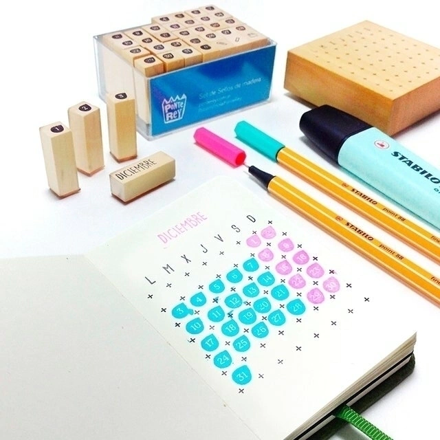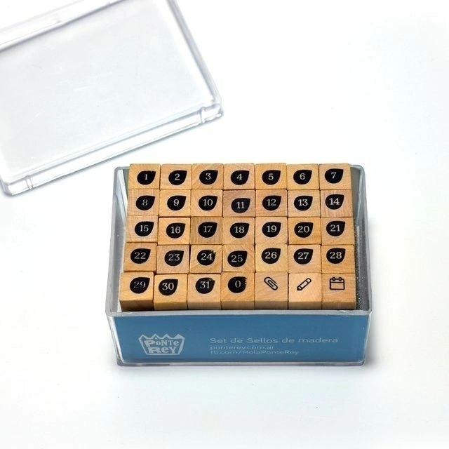 Contiene 35 sellos en soporte de madera de 1 x 1 cm de alto, listo para usar con números y 3 iconos para crear tu propio bullet journal o diario.